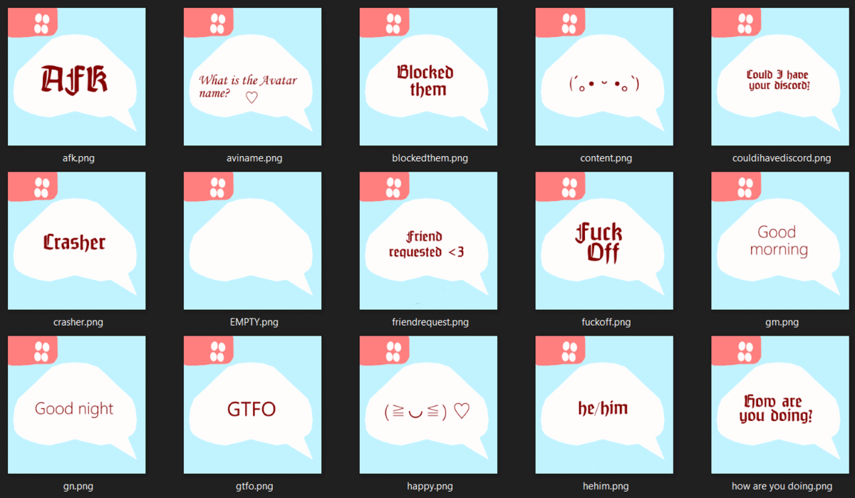 ✧ Simple tutorial for emotes included, as well as basic materials. The same concept is applied to the speech bubbles, except the phrases are meant to be linked to material swaps/animations toggled in your menu. Please have knowledge of material swap toggles if you plan to use this feature.